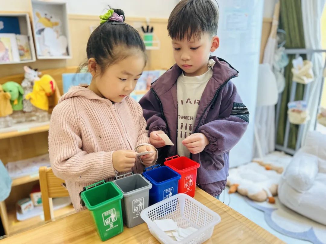 在垃圾分类主题活动中,孩子们仔细辨别每一类垃圾,将它们投放到对应的垃圾桶里。在动手实践的过程中,孩子们不仅初步掌握了垃圾分类的方法,更在心中种下了环保的种子,爱护环境、文明生活的好习惯也在点滴体验中慢慢养成。